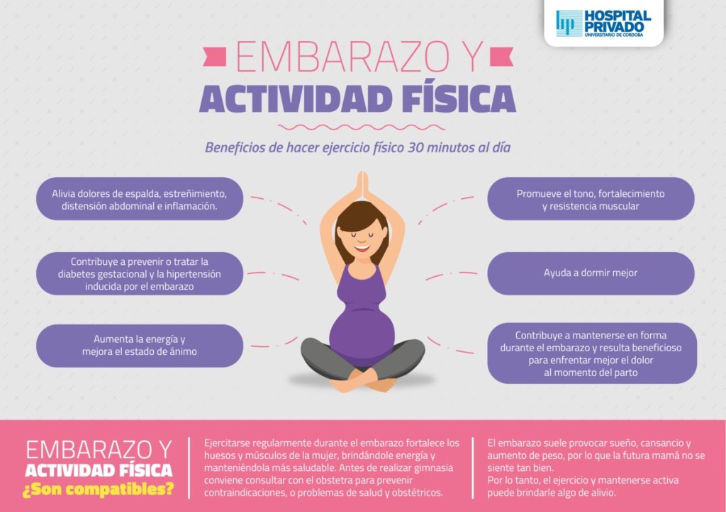 La actividad física durante el embarazo confiere beneficios a la salud materno-fetal: reduce riesgos de hipertensión gestacional, diabetes gestacional, ganancia excesiva de peso, depresión postparto y/o complicaciones durante el parto o para el producto de la gestación. Toda mujer embarazada o durante el postparto y sin contraindicación, debiera: