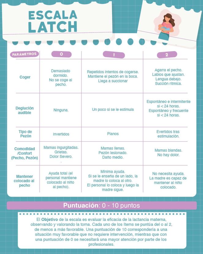 La escala LATCH, por sus siglas en inglés, es una herramienta de valoración del lactante y la madre fiable y sencilla, cuyo empleo tiene un impacto positivo en el proceso de lactancia. Esta escala fue desarrollada por Jensen en 1994 y posteriormente validada al español en el 2008 por Báez y colaboradores. Su empleo permite el estudio de variables como: el agarre del lactante a la mama, el porcentaje de deglución audible, la tipología del pezón de la madre, el confort durante la lactancia o el nivel de ayuda que requiere la madre para mantener la posición correcta del recién nacido al pecho.