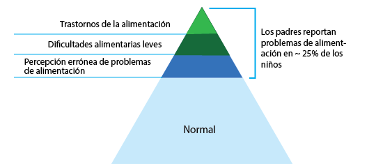 La conceptualización de estas dificultades está representada en una pirámide (Figura 1). Del 25% de los niños identificados por los padres como con dificultades en la alimentación, se estima que sólo el 1% al 5% en el ápice cumple con los criterios para un trastorno alimentario.