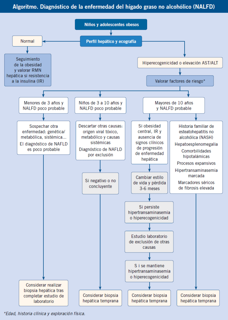 - La Academia Americana de Pediatría (AAP) y la NASPGHAN recomiendan la detección de NAFLD entre los 9 y los 11 años de edad para niños obesos (IMC ≥ P 95) o con sobrepeso (IMC ≥ P 85 < 95) y otros factores de riesgo como adiposidad central, resistencia a la insulina, apnea del sueño, prediabetes o diabetes, dislipidemia o si hay antecedentes familiares de NAFLD. Por su parte, la Sociedad Europea de Gastroenterología, Hepatología y Nutrición recomienda que el despistaje se realice a todos los niños obesos mayores de 3 años a través de ecografía abdominal y pruebas de función hepática.