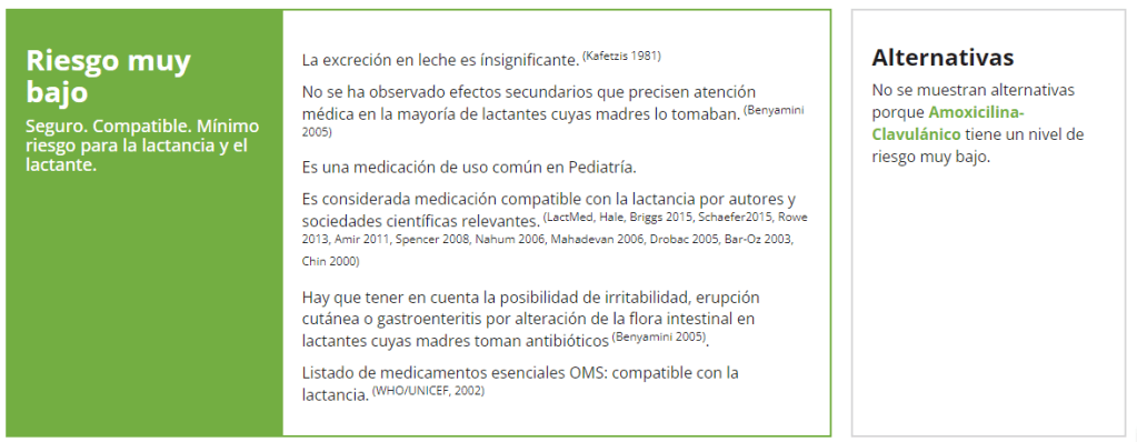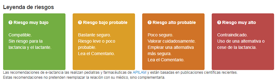 Existe una página web: e-lactancia.org, desarrollada por APILAM, Asociación para la Promoción e Investigación científica y cultural de la Lactancia Materna, cuyas bases de datos son fiables para tomar las decisiones sobre mantenimiento de la lactancia materna. En esta pagina, se clasifica a los fármacos en cuatro grupos: muy seguros, seguros, inseguros (para los que debe de buscarse una alternativa), y muy inseguros, en los que si no existe alternativa terapéutica, debe de retirarse la lactancia materna durante el tiempo que se esté tomando el medicamento.