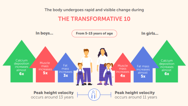 ¿Sabías que la nutrición entre los 5 y los 15 años es tan crucial como en los primeros meses de vida para el crecimiento y desarrollo infantil? A esta etapa, que a menudo pasamos por alto, se le conoce como los ‘Transformadores 10 años’.»