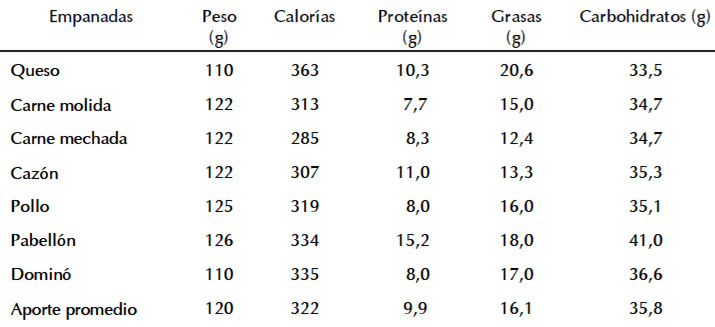 - El contenido calórico promedio de una empanada es de 322 calorías, siendo la de queso la de más alto valor calórico con 363 calorías, y el más bajo la de carne mechada con 285 calorías.