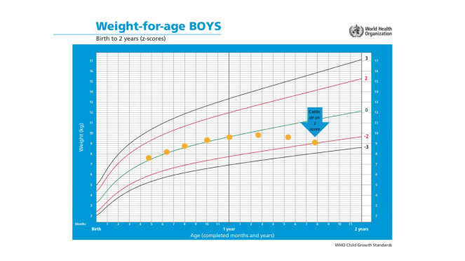 - Caída en peso/talla o IMC ≥ 1.00 z-score: Si el peso se queda atrás respecto a lo que el niño está creciendo en estatura.