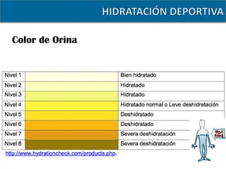 - Deshidratación severa (Rojo/Jugo de manzana): No se debe iniciar la actividad física hasta rehidratar.